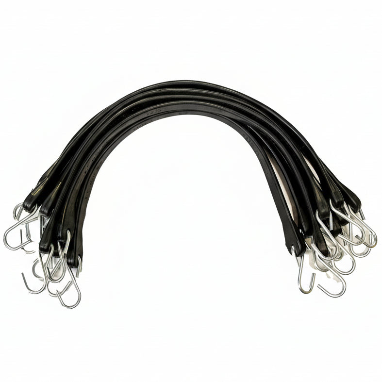 Heavy duty tarp straps feature Natural rubber and zinc-plated S-hooks for a secure grip in tough conditions. Designed to resist the elements, they prevent slipping or loosening, ensuring quick and secure fastening every time.
